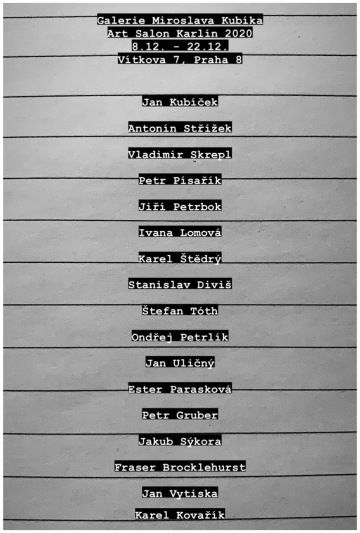 Dovolte nás prosím pozvat Vás na prodejní Art Salon Karlín pod záštitou Galerie Miroslava Kubíka, který proběhne v prostoru Garage Gallery v ulici Vítkova 7 od 8. 12. do 22. 12. 2020